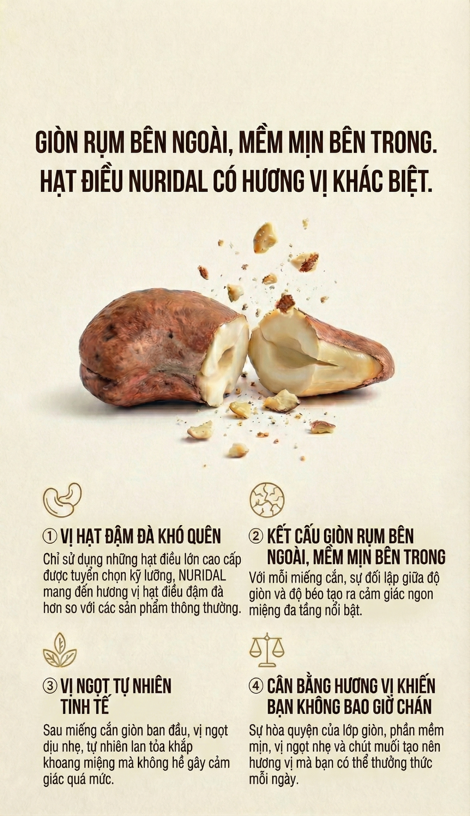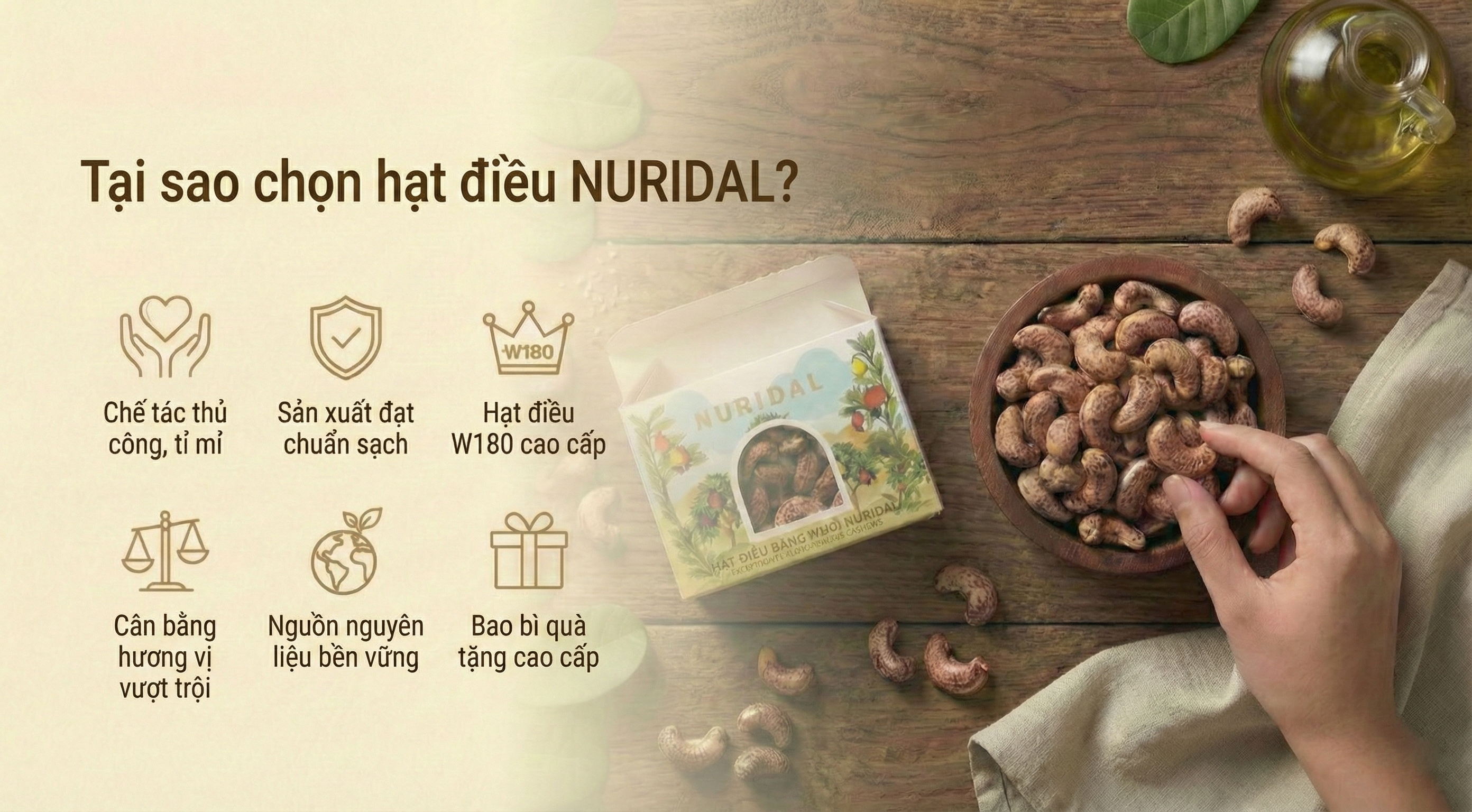 Với sự chính trực, tận tâm và tinh thần chuyên nghiệp, mỗi hạt điều Nuridal bạn thưởng thức đều là minh chứng cho giá trị và cam kết của chúng tôi.