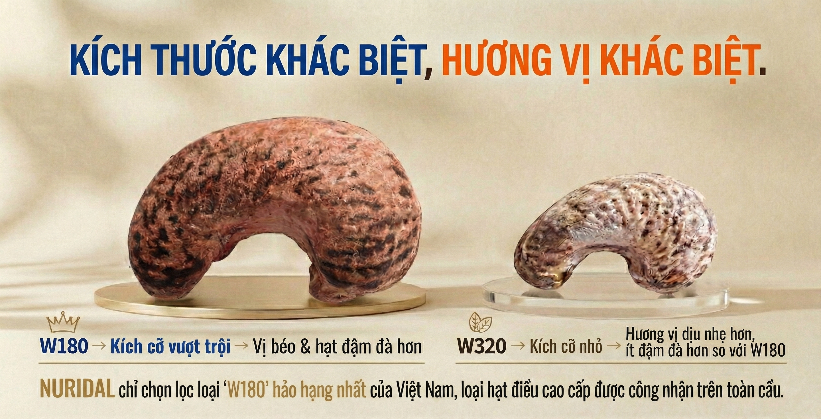 Chúng tôi chọn lọc kỹ lưỡng những hạt điều nguyên W180 – loại nổi tiếng với kích thước vượt trội cùng với vị ngon đặc trưng của sản phẩm.
