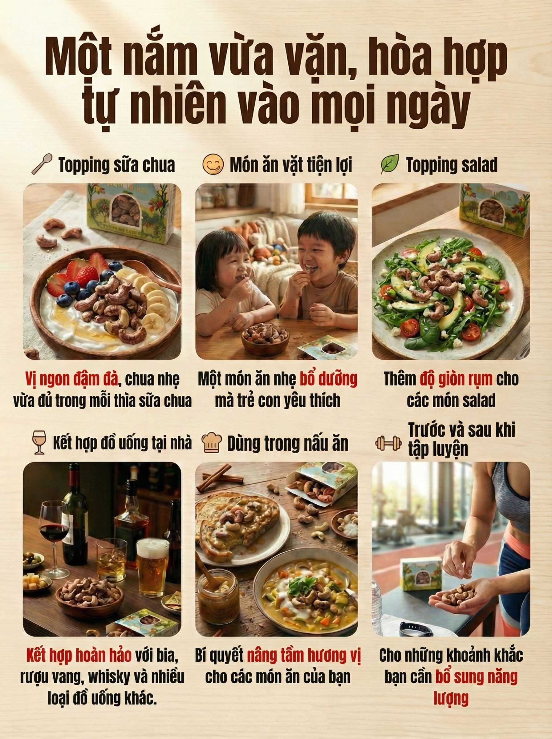Vị ngọt bùi, béo tự nhiên đặc trưng quyện cùng độ giòn vừa phải-mang đến cho bạn trải nghiệm vị giác khó quên trong từng hạt điều.