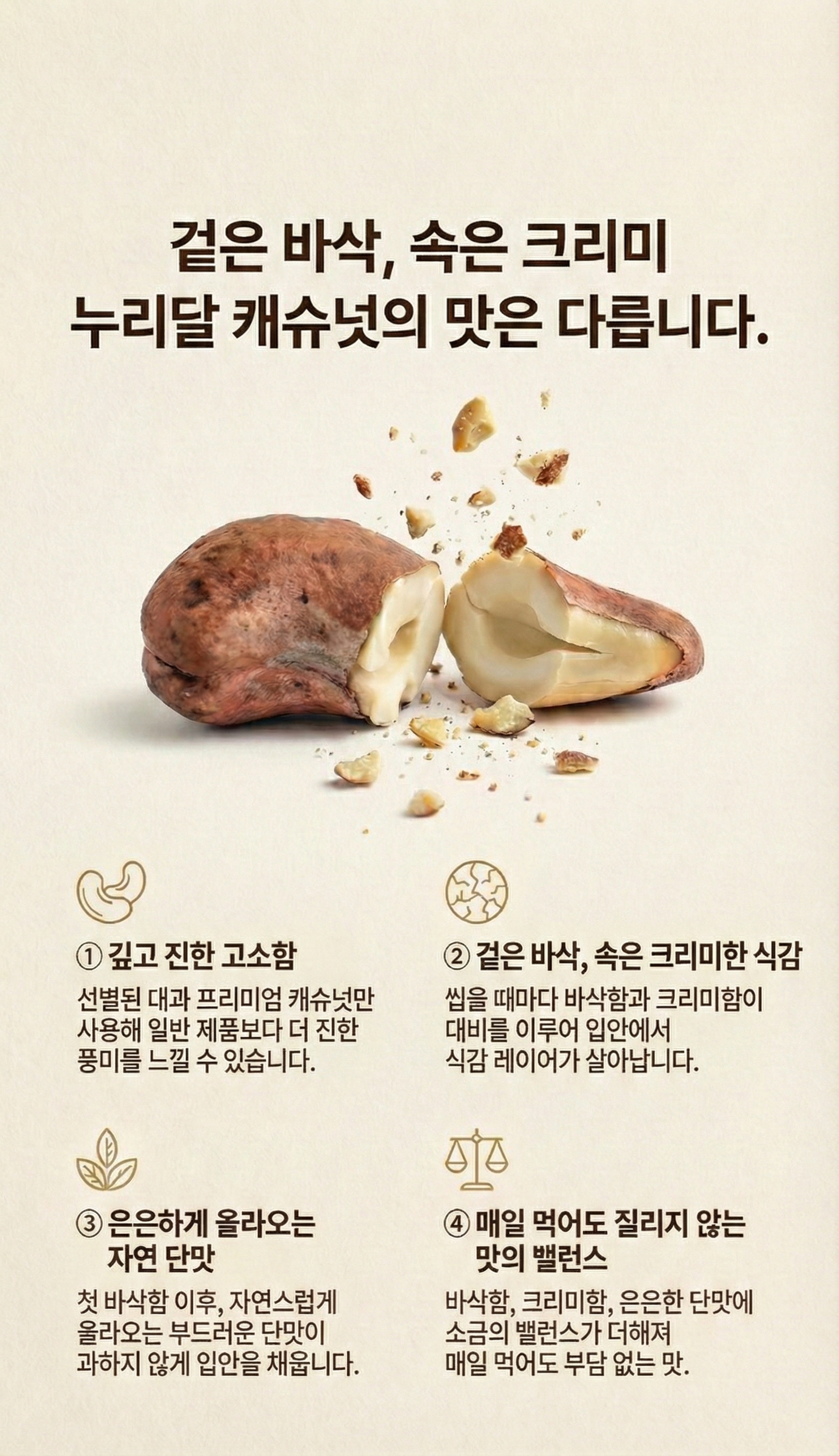 우리 팀은 정직함과 정성, 장인정신으로 일합니다. 여러분이 맛보는 한 알의 NURIDAL 캐슈넛마다 우리의 철학과 약속이 담겨 있습니다.